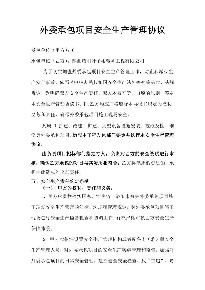 外委承包項目安全生產管理協(xié)議doc