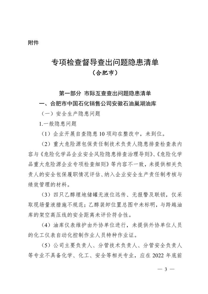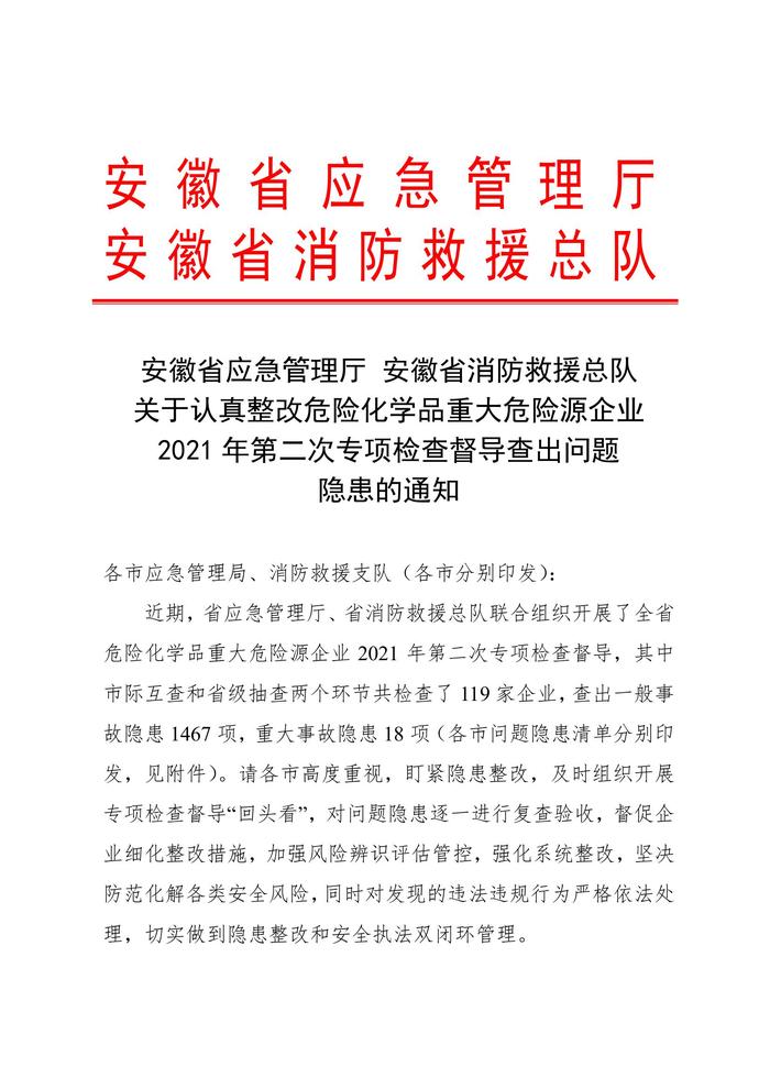 安徽省應(yīng)急管理廳安徽省消防救援總隊(duì)關(guān)于認(rèn)真整改危險(xiǎn)化學(xué)品重大危險(xiǎn)源企業(yè)2021年第二次專項(xiàng)檢查督導(dǎo)查出問題隱患的通知doc