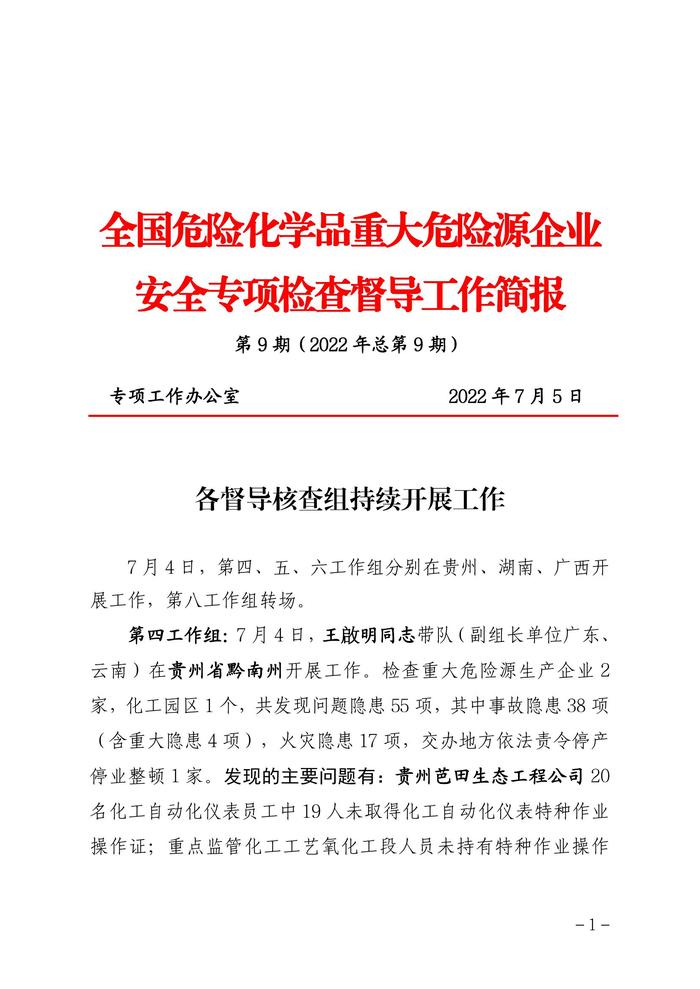 全國危險化學品重大危險源企業(yè)專項檢查督導工作簡報(第9期)(1)pdf