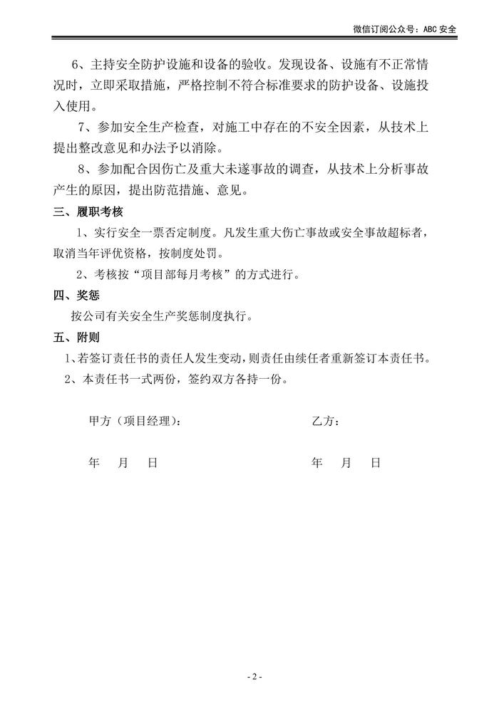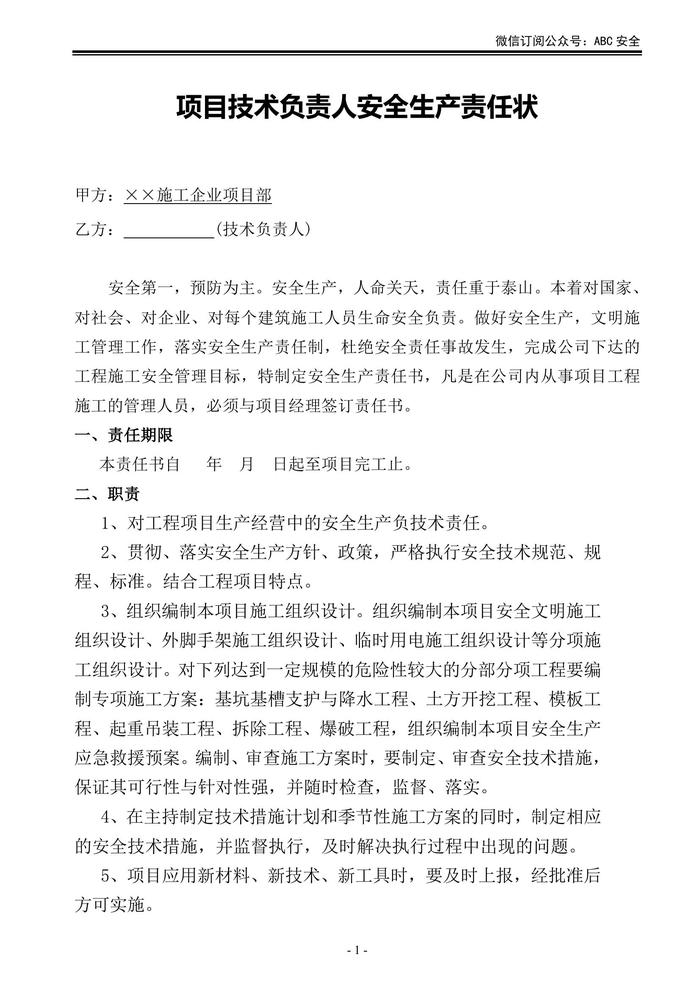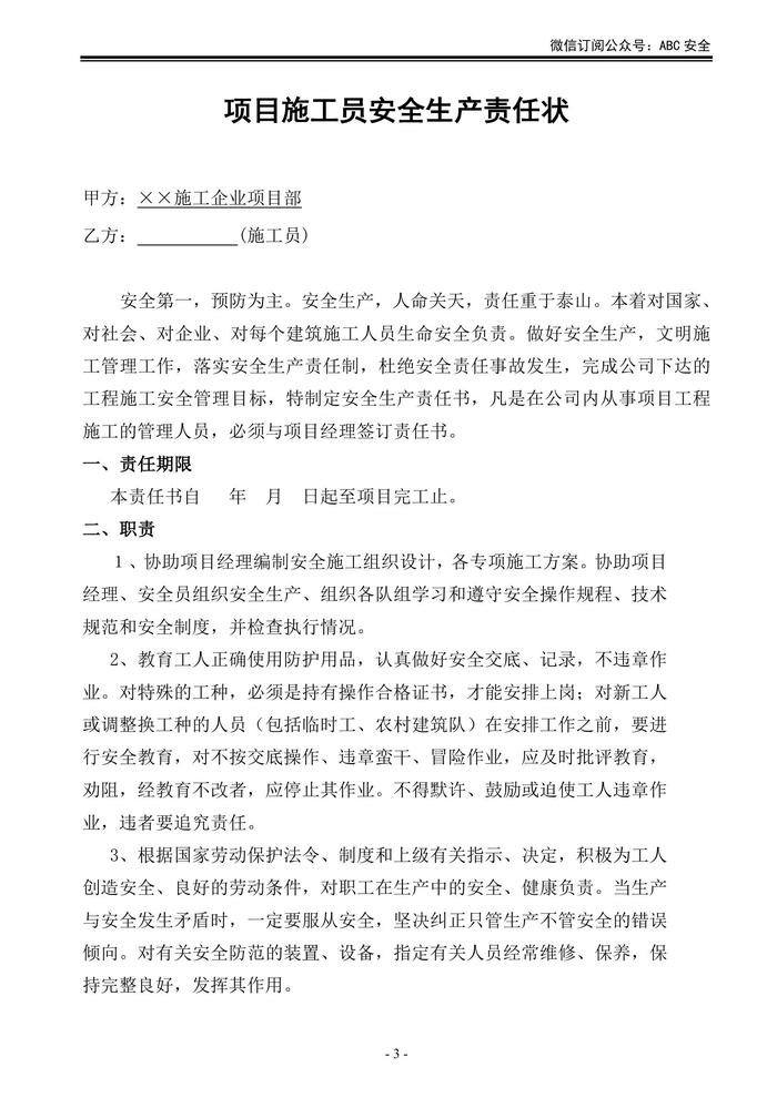 施工單位項(xiàng)目部各級(jí)人員安全生產(chǎn)責(zé)任狀doc