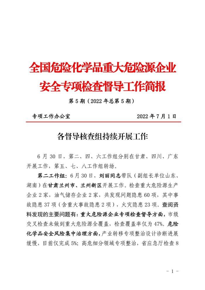 全國危險化學品重大危險源企業(yè)專項檢查督導工作簡報(第5期)(1)pdf