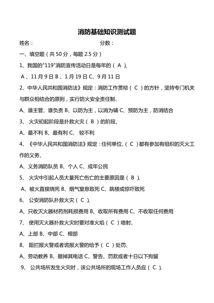 消防基礎知識測試題docx