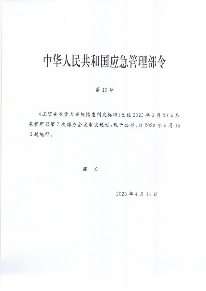2023版《工貿(mào)企業(yè)重大事故隱患判定標(biāo)準(zhǔn)》部令第10號pdf