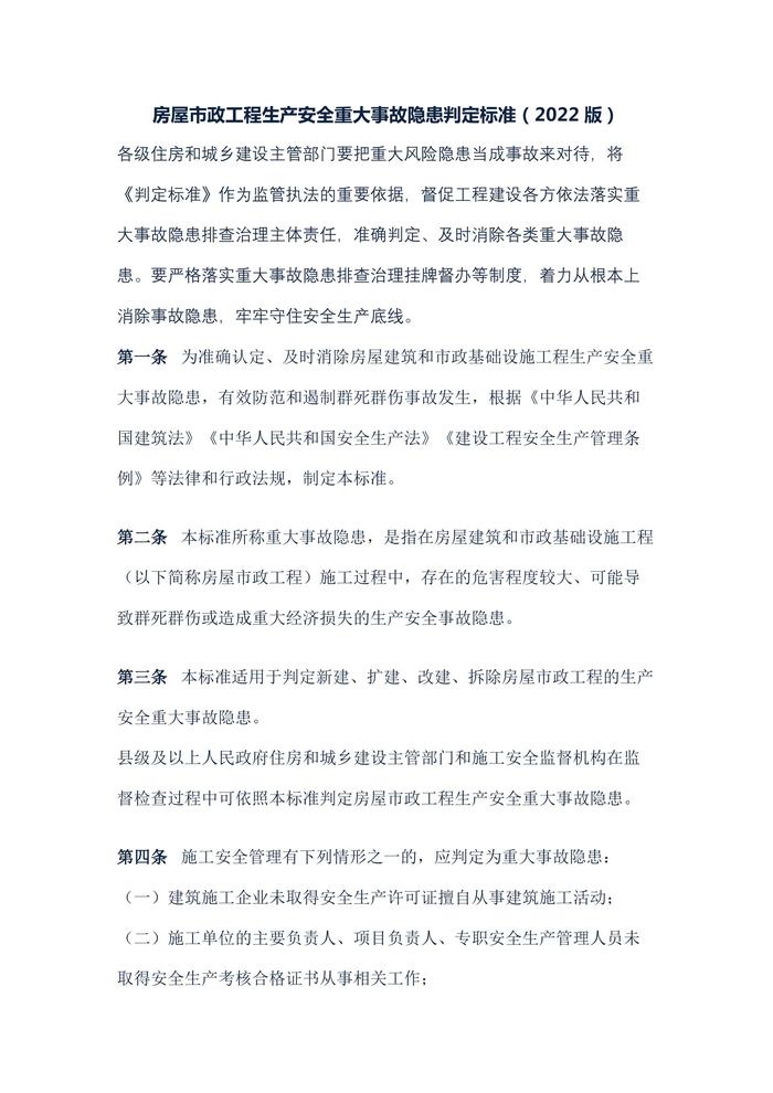房屋市政工程生產(chǎn)安全重大事故隱患判定標準(建質(zhì)規(guī)〔2022〕2號)docx
