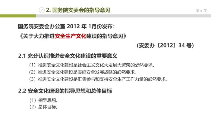 過渡頁 TRANSITION PAGE Chapter.1我國政府對安全文化建設(shè)的要求Contents Page目 錄1. 國家 “安全生產(chǎn)五年規(guī)劃” 的重點工程 國務(wù)院制定的《安全生產(chǎn) “十一五” 規(guī)劃》和《安全生產(chǎn) “十二五” 規(guī)劃》都將安全文化建設(shè)工程列為規(guī)劃的重點工程之一。 2. 國務(wù)院安委會的指導(dǎo)意見國務(wù)院安委會辦公室 2012 年 1月份發(fā)布: 《關(guān)于大力推進安全生產(chǎn)文化建設(shè)的指導(dǎo)意見》 (安委辦〔2012〕34 號)2.1 充分認識推進安全文化建設(shè)的重要意義(3)推進安全文化建設(shè)是匯集參與和支持安全生產(chǎn)工作力量的必然要求。2.2 安全文化建設(shè)的指導(dǎo)思想和總體目標(2)總體目標。(1)推進安全文化建設(shè)是社會主義文化大發(fā)展大繁榮的必然要求。(2)推進安全文化建設(shè)是實施安全發(fā)展戰(zhàn)略的必然要求。(1)指導(dǎo)思想。2. 國務(wù)院安委會的指導(dǎo)意見2.3 切實強化科學發(fā)展、安全發(fā)展理念(4)加強安全文化理論研究。2.4 大力推動安全生產(chǎn)職業(yè)道德建設(shè)(4)繼續(xù)開展企業(yè)安全誠信建設(shè)。(1)加強安全生產(chǎn)宣傳工作。(2)深入開展群眾性安全文化活動。(3)著力提高全民安全素質(zhì)。(1)強化安全生產(chǎn)法制觀念。(2)弘揚高尚的安全監(jiān)管監(jiān)察職業(yè)精神。(3)增強全民安全自覺性。2. 國務(wù)院安委會的指導(dǎo)意見2.5 深入開展安全文化創(chuàng)建活動(3)積極推進城市安全文化建設(shè)。2.6 加快推進安全文化產(chǎn)業(yè)發(fā)展(3)支持安全文化產(chǎn)業(yè)發(fā)展。(1)大力推進企業(yè)安全文化建設(shè)。(2)扎實推進安全社區(qū)建設(shè)。(1)深化相關(guān)事業(yè)單位改革。(2)鼓勵創(chuàng)作安全文化精品。2. 國務(wù)院安委會的指導(dǎo)意見2.7 切實提高安全生產(chǎn)輿論引導(dǎo)能力(3)加強社會輿論和群眾監(jiān)督。2.8 全面加強安全文化宣傳陣地建設(shè)(4)加強安全文化教育基地建設(shè)。(1)把握正確的輿論導(dǎo)向。(2)規(guī)范信息發(fā)布制度。(1)加強新聞媒體陣地建設(shè)。(2)加強互聯(lián)網(wǎng)安全文化陣地建設(shè)。(3)加強安全監(jiān)管監(jiān)察系統(tǒng)宣傳陣地建設(shè)。2. 國務(wù)院安委會的指導(dǎo)意見2.9 強化安全文化建設(shè)保障措施(4)加大安全文化建設(shè)成果交流推廣。(1)加強組織領(lǐng)導(dǎo)。(2)加大安全文化建設(shè)投入。(3)加強安全文化人才隊伍建設(shè)。3. 國家安監(jiān)總局“安全文化建設(shè)五年規(guī)劃” 國家安監(jiān)總局 2006 年和 2011 年分別制定《安全文化建設(shè)十一五綱要》和《安全文化建設(shè)十二五規(guī)劃》安全文化建設(shè) “十二五”規(guī)劃“十二五” 期間安全文化建設(shè)面臨的形勢任務(wù)指導(dǎo)思想、基本原則和規(guī)劃目標主要任務(wù)重點工程保障措施3. 國家安監(jiān)總局“安全文化建設(shè)五年規(guī)劃”3. 國家安監(jiān)總局“安全文化建設(shè)五年規(guī)劃”八項主要任務(wù)3. 國家安監(jiān)總局“安全文化建設(shè)五年規(guī)劃”五項重點工作4. 企業(yè)安全文化建設(shè)示范工程 2010年1月14日,國家安全生產(chǎn)監(jiān)督管理總局發(fā)布了《關(guān)于開展安全文化建設(shè)示范企業(yè)創(chuàng)建活動的指導(dǎo)意見》,包括: 4. 企業(yè)安全文化建設(shè)示范工程4. 企業(yè)安全文化建設(shè)示范工程4. 企業(yè)安全文化建設(shè)示范工程過渡頁 TRANSITION PAGE Chapter.2什么是文化與安全文化1. 什么是文化1. 什么是文化拉丁語:culturaculture——西塞羅colere“耕作和飼養(yǎng)活動” 引申為培養(yǎng)一個人的興趣、精神和智能文化是培育人類的心靈中國古文的含義:“文”既指文字、文章、文采,又指禮樂制度、法律條文等;“化”是“教化”、“教行”的意思。從社會治理的角度而言,“文化” 是指以禮樂制度教化百姓。1. 什么是文化—— [漢] 劉向《說苑,指武 》1. 什么是文化“文化”的首次定義 可考證的首次給出 “文化” 定義的是英國人類學家愛德華·泰勒。他在 1871 年提出:“包括知識、信仰、藝術(shù)、法律、道德、風俗以及作為一個社會成員所獲得的能力與習慣的復(fù)雜整體”。 近百年來,文化一直是人類學、哲學、社會學、心理學、地理學、政治學、生物學等諸多學科眾說紛紜的一個概念。“文化”的首次定義 美國人類學家克洛伊伯和克拉克洪的《文化:概念和定義批判分析》一書,收集了160多種文化定義,并按一些基本主題對它們作了歸類?!獨w類的結(jié)果得出 9 種基本的文化概念:哲學的、藝術(shù)的、教育的、心理學的、歷史的、人類學的、社會學的、生態(tài)學的和生物學的。——這九種概念是對西方文化觀念發(fā)展歷史的一個概括?,F(xiàn)代漢語對“文化”的兩種解釋(愛德華·泰勒的文化定義,屬于狹義的概念)對文化有多種解釋,至今不統(tǒng)一。在現(xiàn)代可分為兩大類2. 什么是安全文化 首先看幾個關(guān)于“安全文化”的認識問題:1)與“文化”、“企業(yè)文化”等概念類似,具有復(fù)雜性,認識不統(tǒng)一,定義較多, 界定模糊。 2)也有廣義說和狹義說。3)關(guān)于安全文化分類:2. 什么是安全文化企業(yè)安全文化自然態(tài)未專門