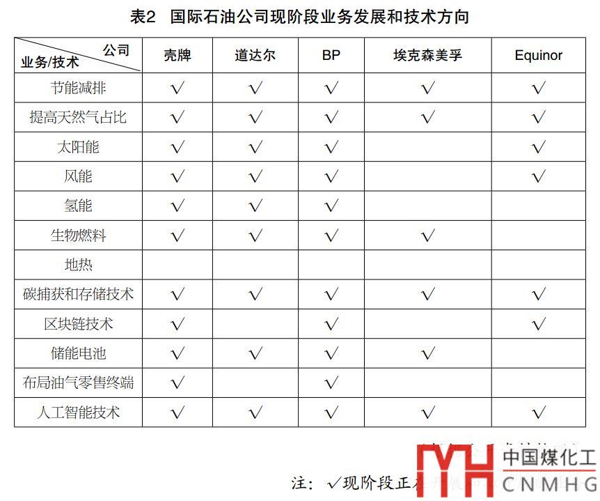 在轉(zhuǎn)型中,國(guó)際石油公司一方面強(qiáng)化油氣核心業(yè)務(wù)競(jìng)爭(zhēng)力,包括降低油氣業(yè)務(wù)成本與碳排放水平,動(dòng)態(tài)優(yōu)化石油業(yè)務(wù)上下游布局,大力發(fā)展天然氣和非常規(guī)油氣;另一方面積極布局低碳業(yè)務(wù),包括投資開(kāi)發(fā)新能源和儲(chǔ)能,提前布局綜合能源服務(wù),加強(qiáng)低碳技術(shù)研發(fā)與應(yīng)用等(見(jiàn)表2)。進(jìn)一步比較可以發(fā)現(xiàn),歐洲大石油公司更加積極發(fā)展新能源業(yè)務(wù),美國(guó)的埃克森美孚公司轉(zhuǎn)型重點(diǎn)則在于以技術(shù)進(jìn)步和提升能效為主,推動(dòng)化石能源清潔化利用,實(shí)現(xiàn)低碳發(fā)展。