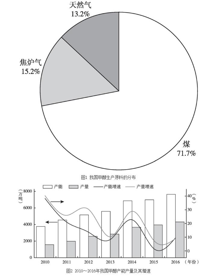 甲醇生產(chǎn)資源廣泛,煤炭、天然氣、焦?fàn)t氣、生物質(zhì),甚至是二氧化碳都可以用來(lái)生產(chǎn)甲醇,且生產(chǎn)技術(shù)成熟。甲醇的生產(chǎn)工藝有很多種,但目前合成氣制甲醇仍是全球甲醇生產(chǎn)采用的主要方法,按合成氣來(lái)源區(qū)分,可以分為煤基甲醇、天然氣基甲醇以及焦?fàn)t氣基甲醇等。因?yàn)樘烊粴獾闹饕煞质羌淄?,碳?xì)浔鹊?,雜質(zhì)含量低,所以用天然氣制甲醇是最為理想的。然而,受“缺油、少氣、相對(duì)富煤”的能源結(jié)構(gòu)影響,我國(guó)的天然氣基甲醇受到限制,而是以煤基甲醇為主,國(guó)外則以天然氣基甲醇為主。圖1是2016年我國(guó)甲醇原料分類(lèi)占比情況,煤基甲醇約占甲醇產(chǎn)量的71.7%,焦?fàn)t氣基甲醇和天然氣基甲醇分別占甲醇產(chǎn)量的15.2%和13.2%。對(duì)于中國(guó)而言,煤基甲醇實(shí)現(xiàn)了煤炭資源的清潔利用,因?yàn)橹袊?guó)的煤炭中約有一半是高硫高灰的劣質(zhì)煤,難以工業(yè)利用,但充分利用劣質(zhì)煤來(lái)生產(chǎn)甲醇可使中國(guó)能源資源增加一倍。以焦?fàn)t氣實(shí)現(xiàn)甲醇的制取主要是以煤為原料間接進(jìn)行的。焦?fàn)t煤氣指的是在生產(chǎn)焦炭過(guò)程中產(chǎn)生的大量副產(chǎn)品,其主要成分是氫氣(55%~60%)和甲烷(23%~27%)。這些焦?fàn)t煤氣除了部分返回?zé)捊範(fàn)t作為加熱的燃料以外,傳統(tǒng)的利用方式就是作為城市居民的生活用氣,但是有很大一部分被燃燒后排入大氣。焦?fàn)t煤氣由于富氫是生產(chǎn)甲醇的優(yōu)質(zhì)原料。利用焦?fàn)t煤氣制甲醇不僅實(shí)現(xiàn)了資源的充分利用,還保護(hù)了生態(tài)環(huán)境,這對(duì)于改善大氣質(zhì)量有著積極的作用。圖2是我國(guó)2010~2016年甲醇產(chǎn)能產(chǎn)量情況,2016年我國(guó)甲醇產(chǎn)能為7638.5萬(wàn)噸,產(chǎn)量?jī)H為4313.6萬(wàn)噸,有數(shù)千萬(wàn)噸富余,利用甲醇替代柴油,不僅有利于像焦?fàn)t氣等資源得到充分利用,而且有利于過(guò)剩產(chǎn)能的轉(zhuǎn)移。