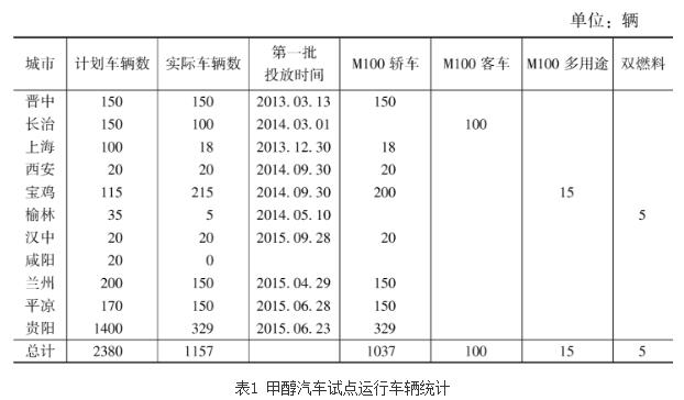 2012年,我國(guó)工業(yè)和信息化部印發(fā)《關(guān)于開(kāi)展甲醇汽車(chē)試點(diǎn)工作的通知》(工業(yè)和信息化部節(jié)〔2012〕42號(hào)),正式啟動(dòng)了在山西、陜西、貴州、甘肅和上海開(kāi)展的甲醇汽車(chē)試點(diǎn)工作。參加試點(diǎn)工作任務(wù)的主要輕型車(chē)和重型車(chē)分別為吉利甲醇汽車(chē)(M100)和陜汽集團(tuán)的甲醇/柴油組合燃燒重卡。表1是甲醇汽車(chē)試點(diǎn)運(yùn)行車(chē)輛統(tǒng)計(jì)表。截至2017年底,各城市甲醇汽車(chē)試點(diǎn)工作已全部通過(guò)工信部的驗(yàn)收,在5省市10地市歷時(shí)5年的試點(diǎn)實(shí)踐中,1024輛不同類(lèi)型的甲醇汽車(chē),采取不同的運(yùn)行模式,總運(yùn)行里程達(dá)1.8億公里,乘用車(chē)百公里甲醇燃料消耗在15升左右,燃料消耗比照同樣類(lèi)型汽油車(chē),等熱值替代比例從理論值(2.16∶1)降為1.7∶1,按汽油等熱值計(jì)算平均能量轉(zhuǎn)換效率可提高20%以上;使用柴油/甲醇組合燃燒技術(shù)的商用車(chē)柴油燃料替代率超過(guò)30%,替代比例為1.2∶1,比照柴油消耗,等熱值計(jì)算平均能量轉(zhuǎn)換效率平均提高12%以上。