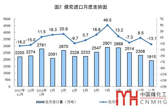 11月份,進(jìn)口煤炭1915萬(wàn)噸,同比下降13.1%,進(jìn)口量比上月減少393萬(wàn)噸。1-11月份,進(jìn)口煤炭2.7億噸,同比增長(zhǎng)9.3%。