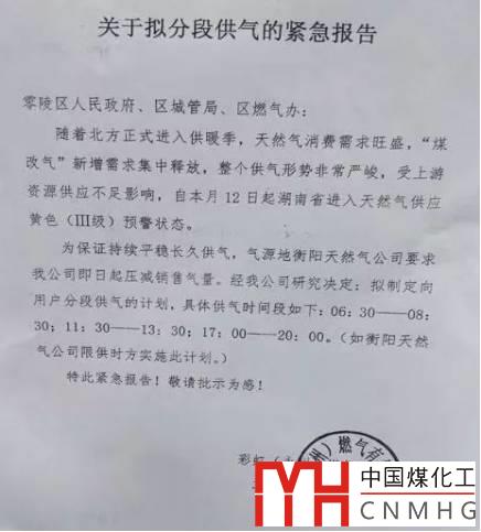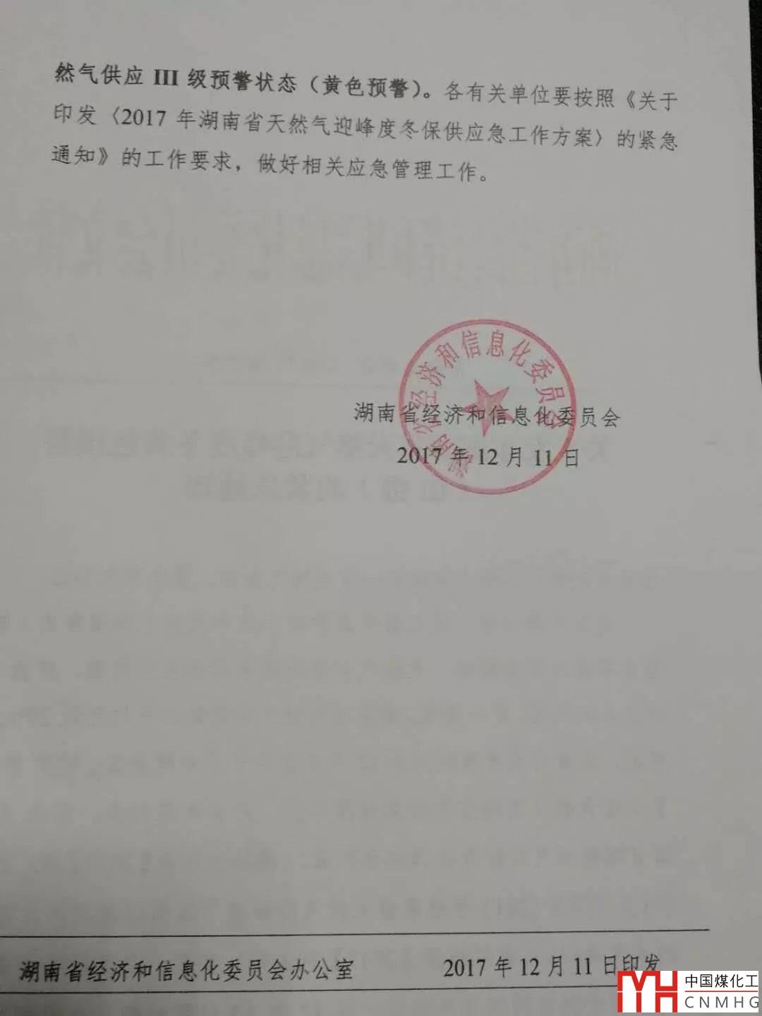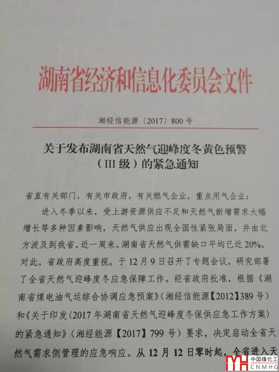 12月11日湖南省經(jīng)濟和信息化委員會印發(fā)了《關(guān)于發(fā)布湖南省天然氣迎峰度冬黃色預(yù)警(III級)的緊急通知》。湖南啟動了全省天然氣需求側(cè)管理的應(yīng)急響應(yīng),全省進入天然氣供應(yīng)黃色(Ⅲ級預(yù)警)狀態(tài)。