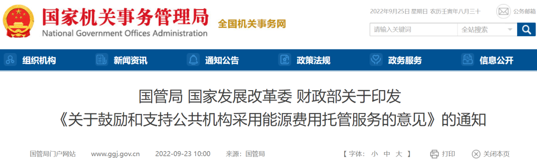 為深入學習貫徹習近平生態(tài)文明思想和習近平總書記關于機關事務工作的重要指示精神,堅決落實黨中央、國務院關于碳達峰、碳中和決策部署,鼓勵公共機構(gòu)采用能源費用托管服務,調(diào)動社會資本參與公共機構(gòu)節(jié)約能源資源工作,推進公共機構(gòu)綠色低碳轉(zhuǎn)型,我們制定了《關于鼓勵和支持公共機構(gòu)采用能源費用托管服務的意見》,現(xiàn)印發(fā)給你們,請結(jié)合實際認真落實。