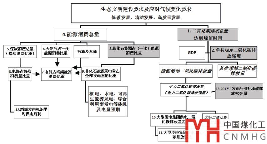 注:圖中指標中標有數(shù)字的是表2文件中確定的具有明確目標值的指標;灰底黑字指標是中國對國際社會有明確目標值的指標;斜體字的指標是還未納入或者沒有明確目標的指標如二氧化碳排放量指標;圖中既沒有數(shù)字也不是斜體字的指標則是在相關(guān)規(guī)劃中有預(yù)期性目標的指標或者與低碳電力發(fā)展相關(guān)度相對較低的指標。