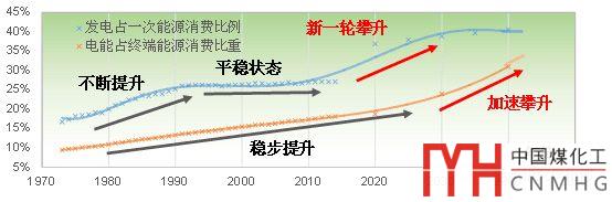 因此,當(dāng)前世界范圍內(nèi)的全球協(xié)作化、共享融合化、互聯(lián)信息化、工業(yè)現(xiàn)代化、清潔低碳化將助推電氣化進程進入新一輪更高層次、更加泛在的發(fā)展階段,即“再電氣化”階段。在生產(chǎn)側(cè),預(yù)計2030年發(fā)電用能占一次能源消費比重將達到40%;在消費側(cè),預(yù)計2040年前后電能占終端能源消費比重將突破30%的“天花板”。