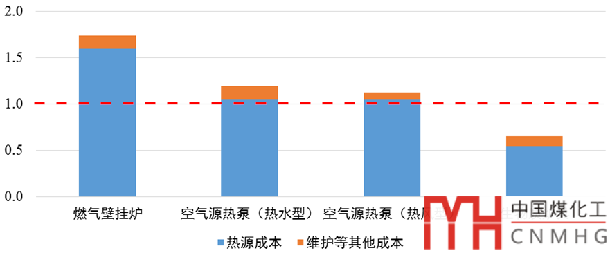 分散供暖方式中,分戶式生物質(zhì)供暖運(yùn)行成本最低,僅是燃煤鍋爐的0.7倍,熱泵供暖與燃煤鍋爐相當(dāng),壁掛爐供暖運(yùn)行成本是燃煤鍋爐的1.5~2.0倍。