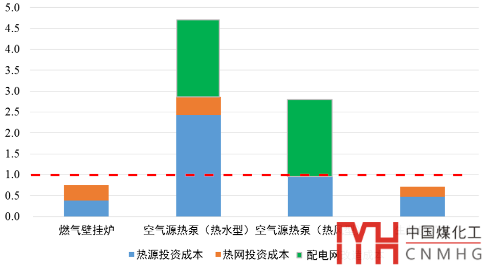 分散供暖方式中,燃?xì)獗趻鞝t、戶用生物質(zhì)爐具單位面積投資成本較低,是燃煤鍋爐的0.7~0.8倍;熱泵供暖主要包括空氣源熱泵、地源熱泵等,這里以空氣源熱泵為例分析,不考慮配電網(wǎng)改造成本時(shí),分戶式空氣源熱泵(熱風(fēng)型)單位面積投資成本略低于燃煤鍋爐,分戶式空氣源熱泵(熱水型)投資成本較高,考慮配電網(wǎng)改造成本后,分戶式熱泵投資成本均比較高。分戶式電供暖的配電網(wǎng)改造成本要明顯高于集中式電供暖的配電網(wǎng)改造成本。