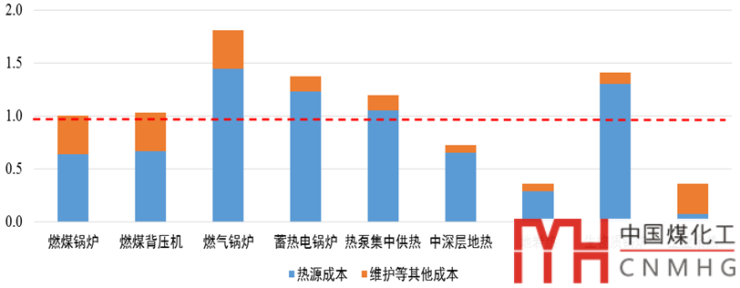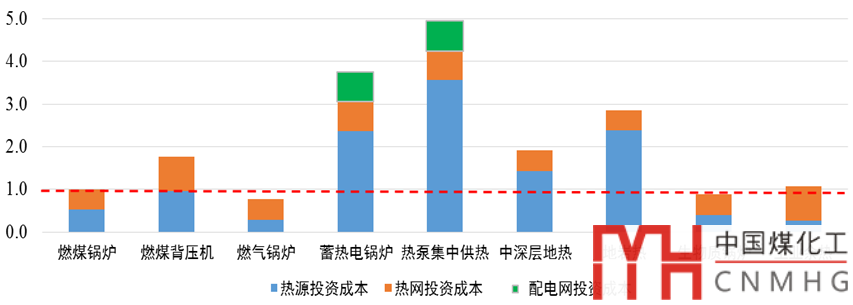 初投資成本方面,集中供暖方式中,燃?xì)忮仩t單位面積初投資低于燃煤鍋爐,生物質(zhì)鍋爐、工業(yè)余熱單位面積初投資與燃煤鍋爐相當(dāng),燃煤背壓機(jī)與中深層地?zé)釂挝幻娣e初投資是燃煤鍋爐的1.5~2.0倍,集中式電供暖投資成本最高,是燃煤鍋爐的3.5~5倍,主要是供熱系統(tǒng)造價(jià)比較貴,配電網(wǎng)改造成本在總成本中占比約為15%~20%;地巖熱單位面積投資成本高于中深層地?zé)?,是燃煤鍋爐的2.5~3.0倍。