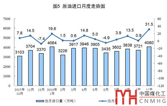 10月份進(jìn)口原油4080萬(wàn)噸,同比增長(zhǎng)31.5%,增速比上月加快30.6個(gè)百分點(diǎn);進(jìn)口量環(huán)比增加359萬(wàn)噸,日均進(jìn)口131.6萬(wàn)噸,再創(chuàng)新高。1-10月份,進(jìn)口原油37716萬(wàn)噸,同比增長(zhǎng)8.1%。
