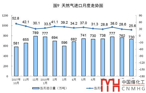 10月份,進(jìn)口天然氣730萬(wàn)噸,同比增長(zhǎng)25.6%,增速比上月回落3個(gè)百分點(diǎn),進(jìn)口量環(huán)比減少32萬(wàn)噸。1-10月份,進(jìn)口天然氣7206萬(wàn)噸,同比增長(zhǎng)33.1%。