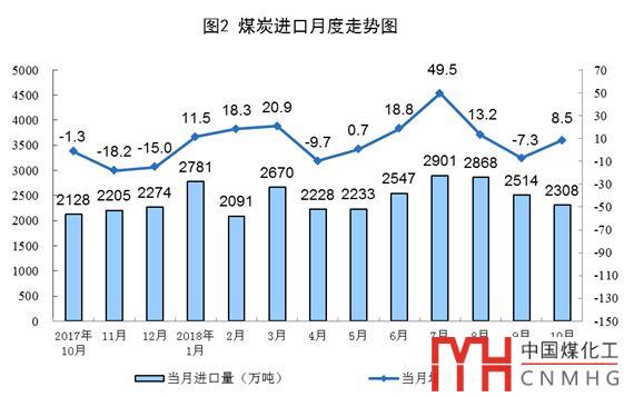 10月份,進(jìn)口煤炭2308萬(wàn)噸,同比增長(zhǎng)8.5%,上月為下降7.3%,增速由負(fù)轉(zhuǎn)正。1-10月份,進(jìn)口煤炭2.5億噸,同比增長(zhǎng)11.5%。