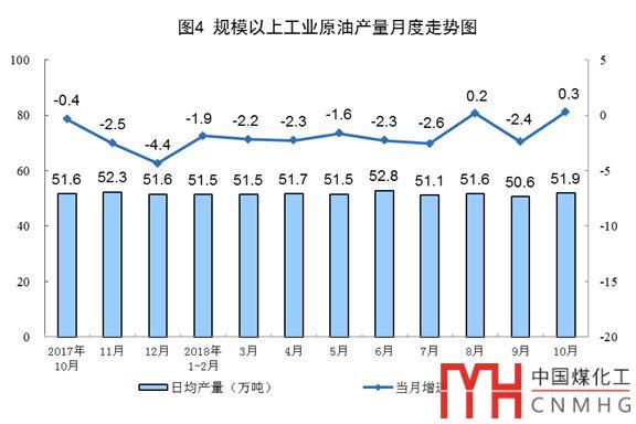 10月份,生產(chǎn)原油1609萬(wàn)噸,同比增長(zhǎng)0.3%,上月受臺(tái)風(fēng)“山竹”影響下降2.4%;日均產(chǎn)量51.9萬(wàn)噸,環(huán)比增加1.3萬(wàn)噸。1-10月份,原油產(chǎn)量15721萬(wàn)噸,同比下降1.7%。