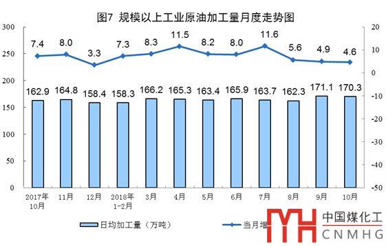 10月份,原油加工量5278萬(wàn)噸,同比增長(zhǎng)4.6%,增速比上月回落0.3個(gè)百分點(diǎn);日均加工170.3萬(wàn)噸,環(huán)比減少0.8萬(wàn)噸。1-10月份,原油加工量50510萬(wàn)噸,同比增長(zhǎng)7.8%。