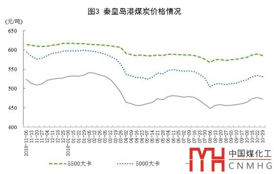 11月初,秦皇島港5500大卡煤炭綜合交易價(jià)格為每噸584元,比10月初上漲3元;5000大卡煤炭為每噸530元,上漲7元;4500大卡煤炭為每噸472元,上漲7元。