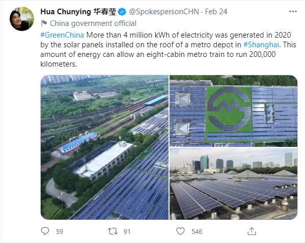 近日,中國(guó)外交部發(fā)言人華春瑩在推特上發(fā)了這樣一條動(dòng)態(tài),向全世界介紹了中國(guó)的一項(xiàng)新能源樣板工程——上海地鐵龍陽(yáng)路基地3.66MW光伏發(fā)電項(xiàng)目。字里行間洋溢著華春瑩女士對(duì)該項(xiàng)目 “點(diǎn)贊”之情,上海地鐵龍陽(yáng)路基地光伏發(fā)電項(xiàng)目也隨之引起廣泛關(guān)注,其中天合光能提供的光伏組件產(chǎn)品達(dá)12912塊,年均發(fā)電量約為340萬(wàn)度,可供一列8節(jié)編組的地鐵列車跑20萬(wàn)公里。天合光能已經(jīng)總計(jì)為上海地鐵光伏發(fā)電項(xiàng)目提供7MW組件。