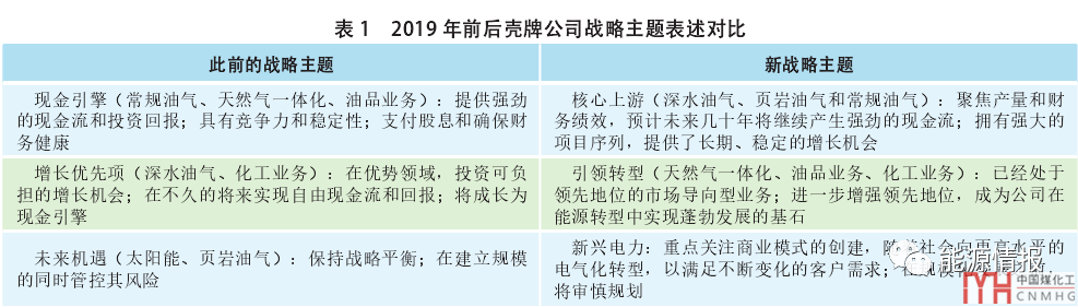 2019年6月,殼牌公司對(duì)業(yè)務(wù)組合的戰(zhàn)略主題進(jìn)行了調(diào)整,確保其業(yè)務(wù)組合能夠很好地適應(yīng)未來發(fā)展環(huán)境(見表1)。新的戰(zhàn)略主題表述,聚焦于有助于推進(jìn)公司能源轉(zhuǎn)型的領(lǐng)域,以及未來十年需求保持增長(zhǎng)的領(lǐng)域。殼牌將繼續(xù)發(fā)展油氣業(yè)務(wù),包括深水和頁巖油氣,以滿足需求增長(zhǎng),通過提供石油、天然氣和低碳能源,強(qiáng)化其在油氣行業(yè)中的領(lǐng)先地位。