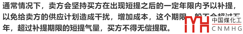 在實際交易過程中,買方按照照付不議量支付合同價款后,可能存在本年度提取的氣量低于已付款的氣量的情形,這樣就造成買方出現(xiàn)短提量,年凈照付不議量減去該合同年實際提取的天然氣數量為該合同年的短提量。對于短提量,一般買賣雙方都會同意,買方支付照付不議款后,可以在后續(xù)的合同年度中予以補提,對于補提量,一般買方無需另行支付價款。合同中對于補提的約定,應當注意以下幾點: