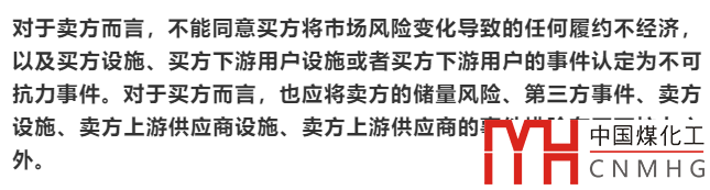 鑒于照付不議合同的特殊性,不可抗力條款未必嚴格符合中國合同法規(guī)定的不可抗力“三不”原則(不可預見、不可克服、不可避免)的事件來認定,需要在合同中明確界定。