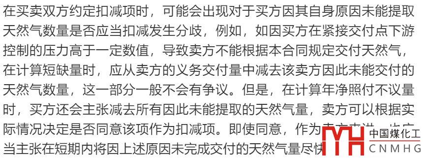 三是凈照付不議量,指為該合同年的年照付不議量減去每年可以扣減的數量計算,扣減項可以由雙方進行約定,一般包括該合同年日確認量中因不可抗力賣方未能交付或買方未能接收天然氣數量的累計量、該合同年賣方短缺量、該合同年買方因合同規(guī)定的原因未提取的天然氣數量等。在計算年凈照付不議量時,各項扣減因素均以年為統(tǒng)計單位,且同時符合任一扣減因素的天然氣數量均不得重復計算。