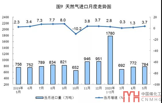 天然氣進口穩(wěn)定增長。5月份,進口天然氣784萬噸,同比增長3.7%。1-5月份,進口天然氣4012萬噸,同比增長1.9%。