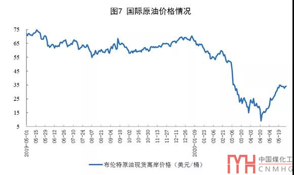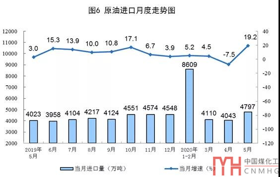 原油進口由降轉(zhuǎn)增,國際原油價格快速回升。5月份,進口原油4797萬噸,同比增長19.2%,上月為下降7.5%。1-5月份,進口原油21558萬噸,同比增長5.2%。5月29日布倫特原油現(xiàn)貨離岸價格為34.15美元/桶,比4月30日的18.11美元/桶回升88.6%。