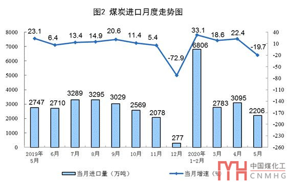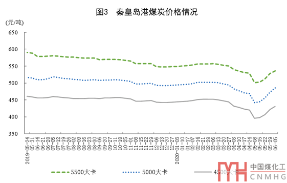 煤炭進口大幅下降,港口交易價格止跌回升。5月份,進口煤炭2206萬噸,環(huán)比減少889萬噸,同比下降19.7%;1-5月份,進口煤炭1.49億噸,同比增長16.8%。港口煤炭綜合交易價格止跌回升,6月5日秦皇島港5500、5000和4500大卡煤炭價格分別為每噸536元、485元和431元,比5月8日的年內(nèi)最低點分別回升35元、43元和35元。