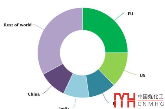 從消費(fèi)地區(qū)看,歐盟是全球可再生能源供熱的最大消費(fèi)地區(qū),其次是美國(guó)和中國(guó)。作為全球主要的可再生能源供熱消費(fèi)國(guó)家/地區(qū),巴西、中國(guó)、歐盟、印度和美國(guó)的可再生能源供熱消費(fèi)量加起來(lái),約占全球總量的三分之二(見(jiàn)圖4)。