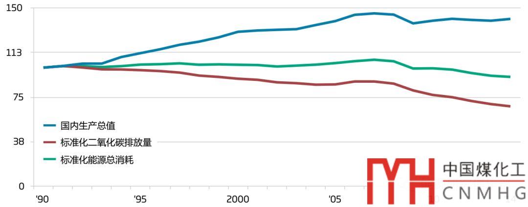 圖10 丹麥經(jīng)濟(jì)增長(zhǎng)、能源消耗和碳排放變化趨勢(shì)
