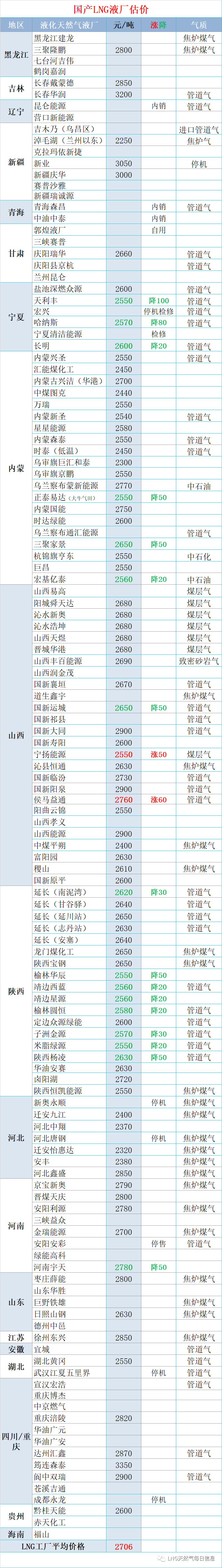 【5月29日】陜西、寧夏、山西、內(nèi)蒙18家LNG液廠降價20-100元/噸。山西2家漲價50-60元/噸。