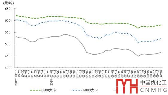 10月初,秦皇島港5500大卡煤炭綜合交易價格為每噸581元,比9月初上漲6元;5000大卡煤炭為每噸523元,上漲10元;4500大卡煤炭為每噸465元,上漲8元。