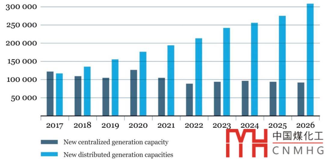 圖2 全球新增集中式和分布式發(fā)電裝機(jī)預(yù)測(cè)(單位:兆瓦)