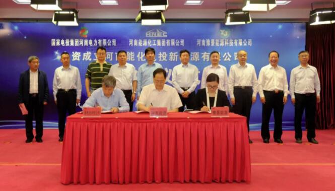 集團(tuán)公司副總經(jīng)理趙廷釗、國家電投集團(tuán)河南電力有限公司副總經(jīng)理張國干、河南豫景能源科技有限公司副總經(jīng)理魏曉霞代表三方共同簽署了《設(shè)立河南能化電投新能源有限公司合資協(xié)議》。