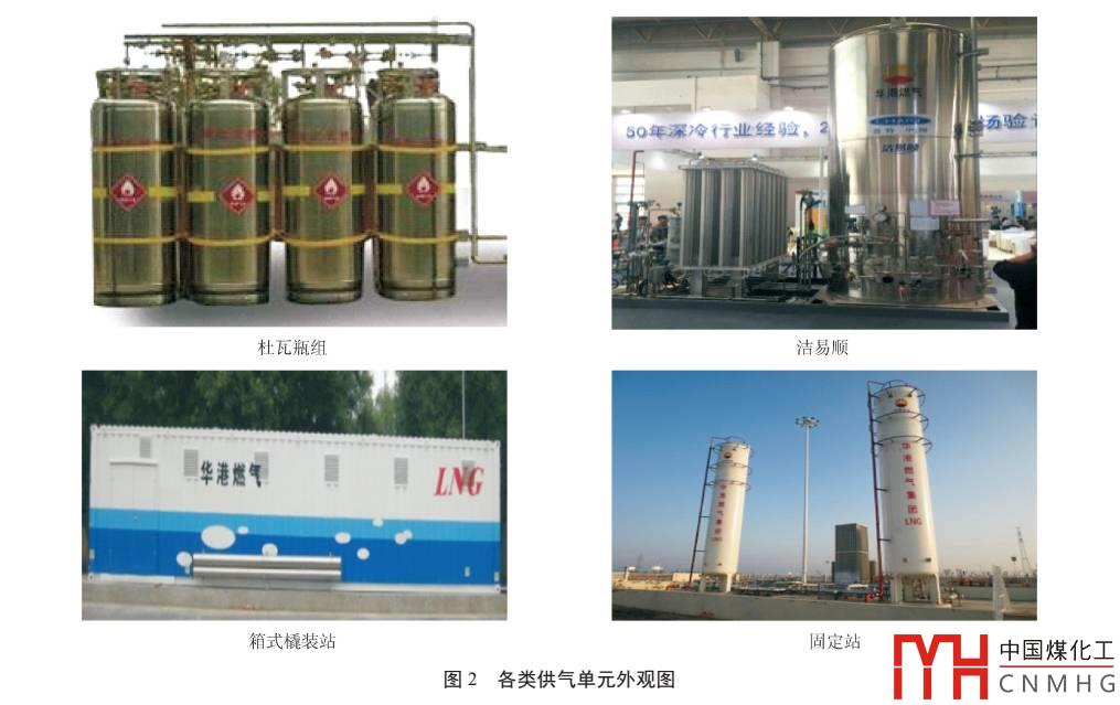 LNG 點供,也叫LNG 區(qū)域供氣單元,適用于輸氣管線不易到達,或由于用量小修建管線不經濟的中小城鎮(zhèn)和工廠等終端用戶。LNG 點供裝置相當于小型LNG 接收氣化站,由LNG 槽車運輸供應、卸貨,LNG 儲罐儲存,LNG 氣化與氣相處理,氣態(tài)天然氣進入管網計量、輸配等環(huán)節(jié)組成。根據用戶用氣量規(guī)模的不同,可分為杜瓦瓶組(單瓶100 ~ 200L)、潔易順(儲罐10.0 ~ 19.6 m3 小型一體橇)、箱式橇裝站(儲罐30 m3 大型一體橇)、固定站(單罐60 ~ 250 m3)等4 類供氣單元(圖2)。