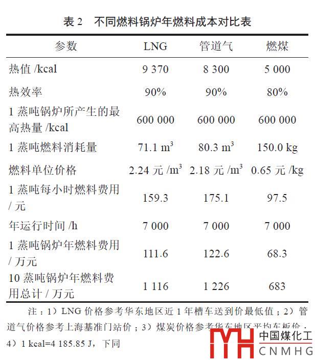 與煤作燃料相比,LNG 每年燃料費用是燃煤的1.6 倍,差距較大。因此,單從燃料使用成本上對比是沒有經濟性可言的,但考慮到燃煤鍋爐的用地面積和人工投入通常是燃氣鍋爐的2 倍,該項超出部分的費用可抵消一部分燃料成本,且燃氣鍋爐更為節(jié)能環(huán)保,近年來也得到國家的大力支持。