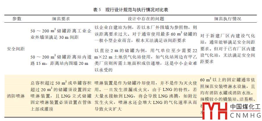 目前,國家并沒有頒布專門針對LNG 氣化站的設計規(guī)范,現(xiàn)有項目均參照GB 50028—2006《城鎮(zhèn)燃氣設計規(guī)范》中的相關規(guī)定(表5),其中包括安全距離、消防噴淋等很多條款均是按照城鎮(zhèn)燃氣安全需求制訂的,并不完全適用于LNG 氣化站項目。若按該規(guī)范執(zhí)行,則大多數項目均不合規(guī)。