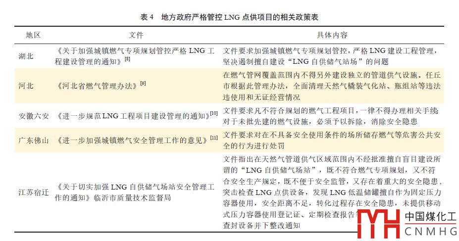 當前,LNG 點供項目存在專項規(guī)范不完善、政府管控難以到位,以及點供企業(yè)對利潤的過分追求等問題,使得部分LNG 點供項目存在一定的安全隱患。同時,城市燃氣企業(yè)出于對自身特許經營權的保護,也極力排斥LNG 點供項目對其經營區(qū)域的蠶食。綜合多方面因素,部分地區(qū)的政府并不鼓勵甚至限制LNG 點供的發(fā)展,在相關文件中提到了一系列嚴格管控LNG 點供項目的政策(表4)。