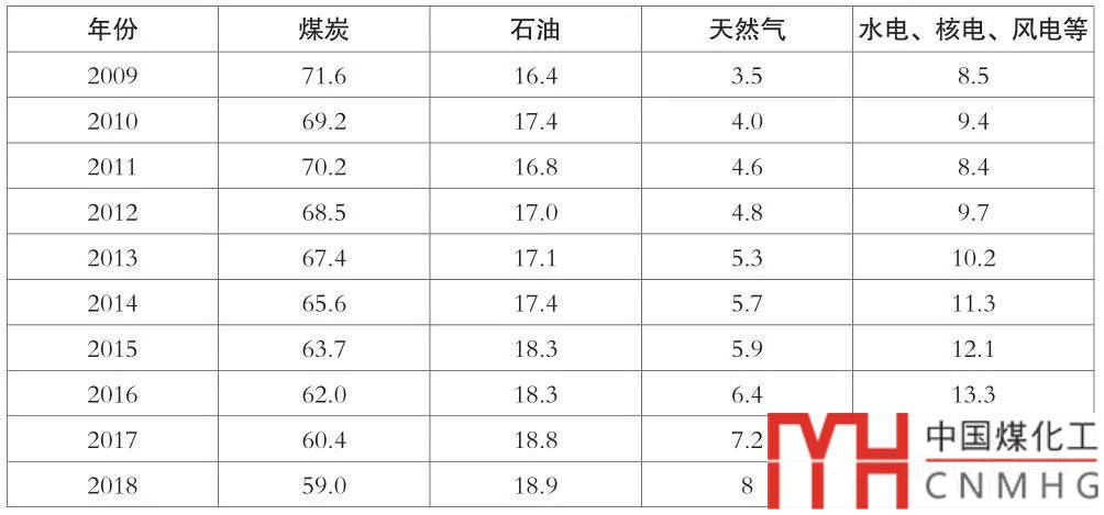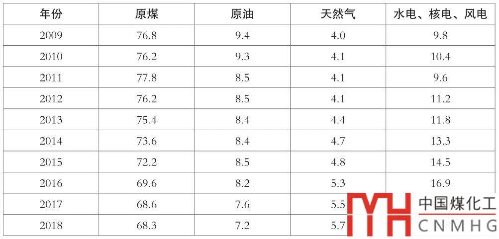 表1-4 2009~2018年分品種能源占能源消費(fèi)總量的比重(單位:%)