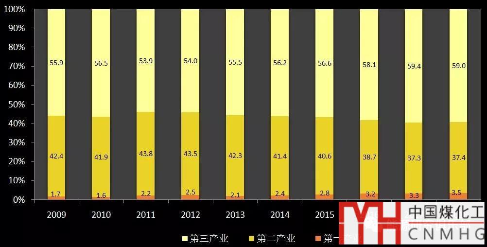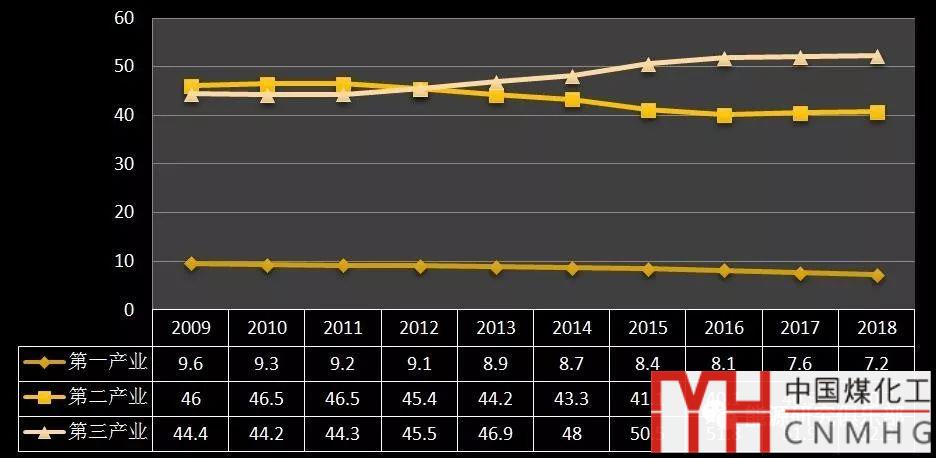 圖1-2 2009~2018年三大產(chǎn)業(yè)增加值占國(guó)內(nèi)生產(chǎn)總值比重(單位:%)
