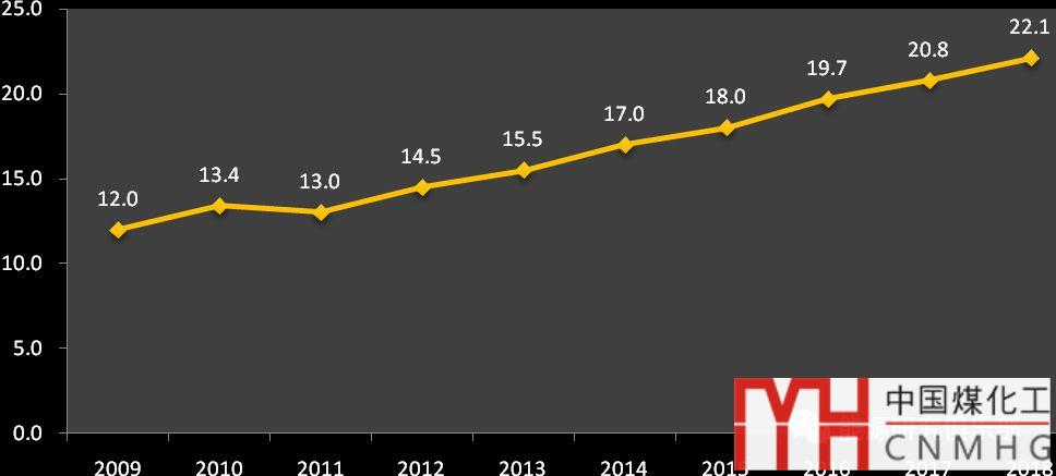 圖1-6 2009~2018年清潔能源消費(fèi)量占能源消費(fèi)總量的比重(單位:%)