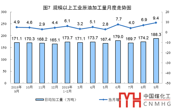 9月份,加工原油5649萬噸,同比增長9.4%,增速比上月加快2.5個百分點;日均加工188.3萬噸,環(huán)比增加14.1萬噸。前三季度,加工原油48038萬噸,同比增長6.2%,增速比上半年加快0.4個百分點。