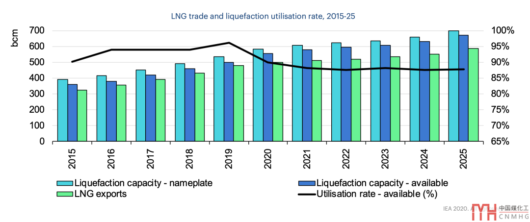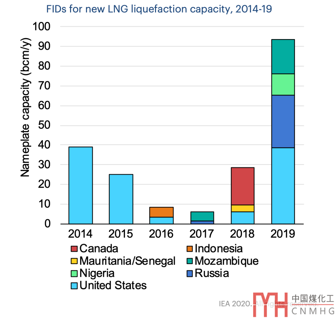 國際能源署表示,近年來做出的LNG項目最終投資決定,將會使2020年至2025年期間每年新增至多1.2億立方米的LNG產能,或約1.63億噸。2019年是LNG新項目投資創(chuàng)紀錄的一個年份,新的最終投資決定 (FID)帶來的新增產能約為950億立方米。