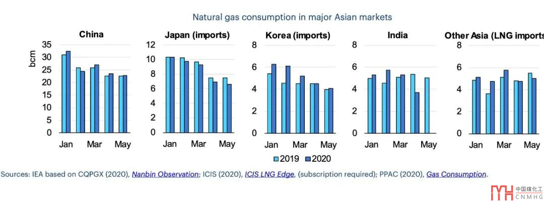 亞洲主要天然氣市場消費量2019-2020年1-5月對比圖